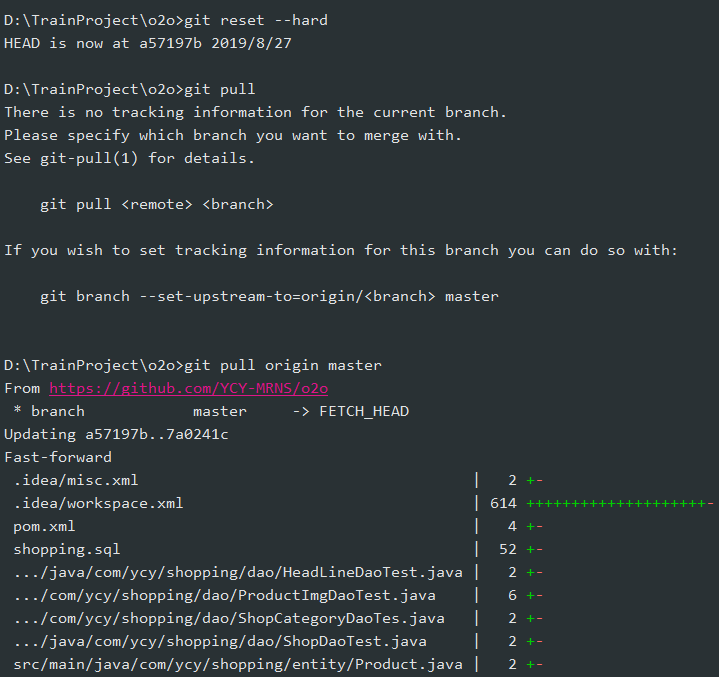 根据提示,可以commit再meger。这里我选择直接使用 git pull ,之前我是使用的 git fetch 是将远程主机的最新内容拉到本地检查了以后决定是否合并到工作本机分支中。使用git pull 可以同时操作了我之前的两个步骤 git fetch+git meger ,则是将远程主机的最新内容拉下来后直接合并。在这之前将 git 重置一下 , git reset --hard。